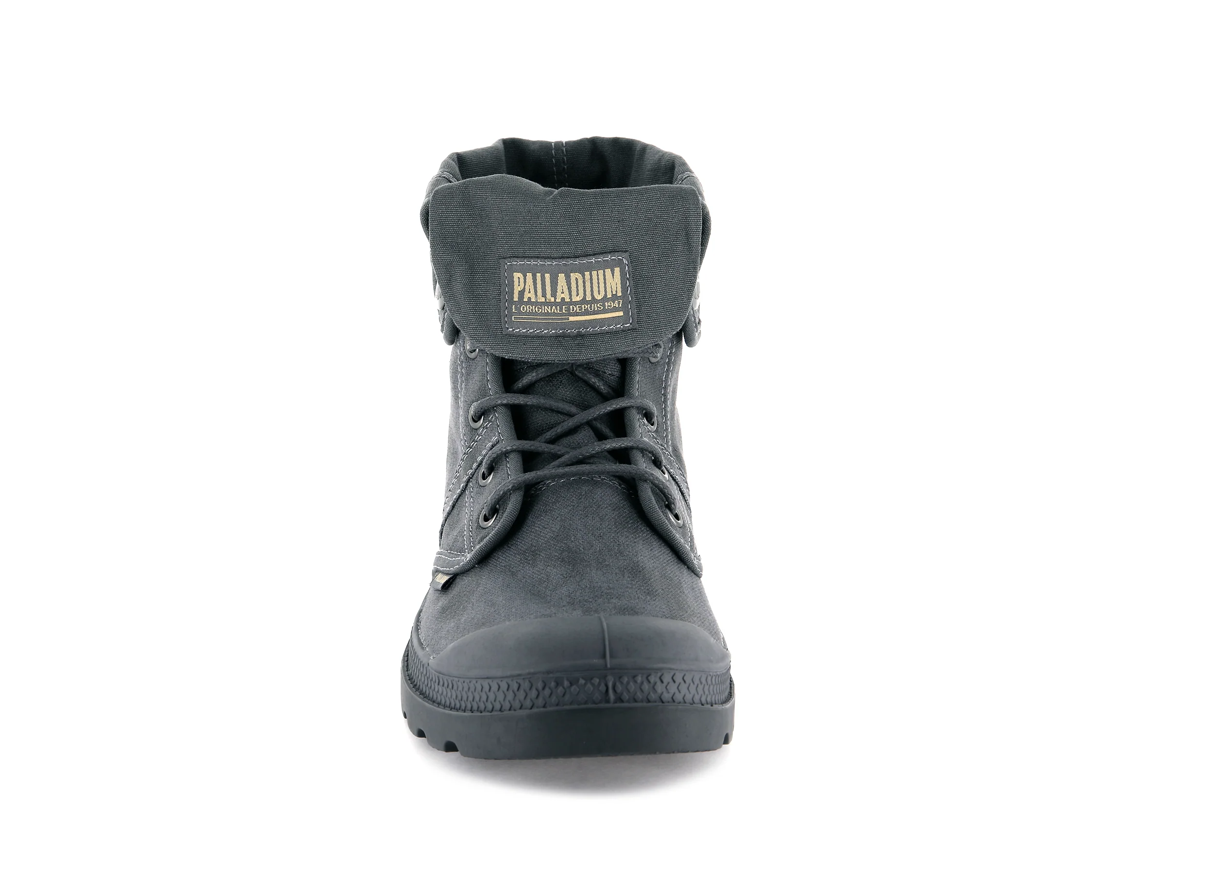 The vintage vibe is heightened by two shades of waxy canvas in this versatile style from Palladium Boots. With the collar up, the hi-tops appear to be coated in an aged veneer. Snapped down, the collar reveals a clean finish on the military-inspired unisex shoes. An officer stripe adds extra support and design detail.